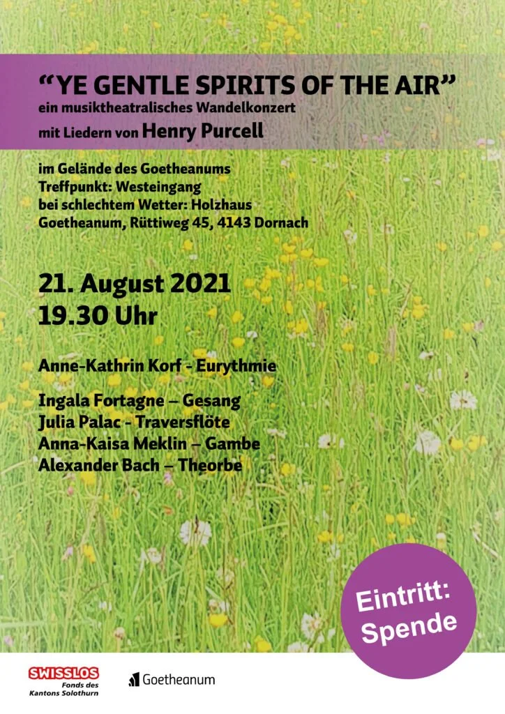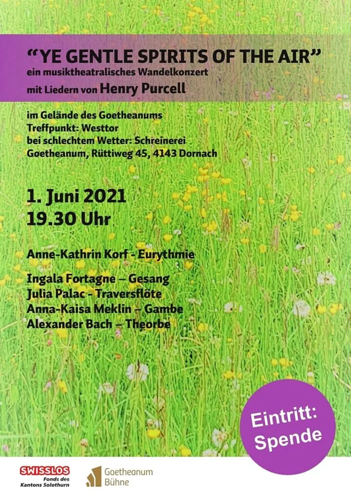 Ausgehend von der derzeitigen Situation der Pandemie, dem brachliegenden Kulturleben, haben wir überlegt, wie wir Kultur trotz allem für die Menschen erlebbar machen können. Einerseits interessierte uns die Realisierung eines Konzertes außerhalb eines Raumes und andererseits wollten wir Eurythmie (Tanz) mit Musik und Gesang verbinden und einen theatralischen Moment im Konzert schaffen. In unserem Programm erklingt durch die Kunst von Gesang und Musik Hörbares und wird durch die Kunst der Eurythmie sichtbar gemacht. An einem Sommerabend, in der Dämmerung, versammeln wir uns mit dem Publikum in der Naturkulisse. Mit Hilfe der Lieder aus der Oper “The fairy Queen” von Henry Purcell (1659-1695) u.a. lassen wir einen Sommernachtstraum entstehen. Die Bearbeitung der Musik für die Besetzung Laute, Gambe und Traversflöte ersetzt das Orchester. Die Kammermusikbesetzung hilft uns auch, wenn wettertechnisch möglich, unter freien Himmel zu musizieren. Wir konnten damit auf die Zeit reagieren und live Musik (im Sommer 2021) anbieten. Wir fanden drei verschiedene Orte auf dem Hügel am Goetheanum in Dornach. Auch akkustisch war es reizvoll und spannend für das Publikum, wie sich der Klang von Ort zu Ort veränderte
